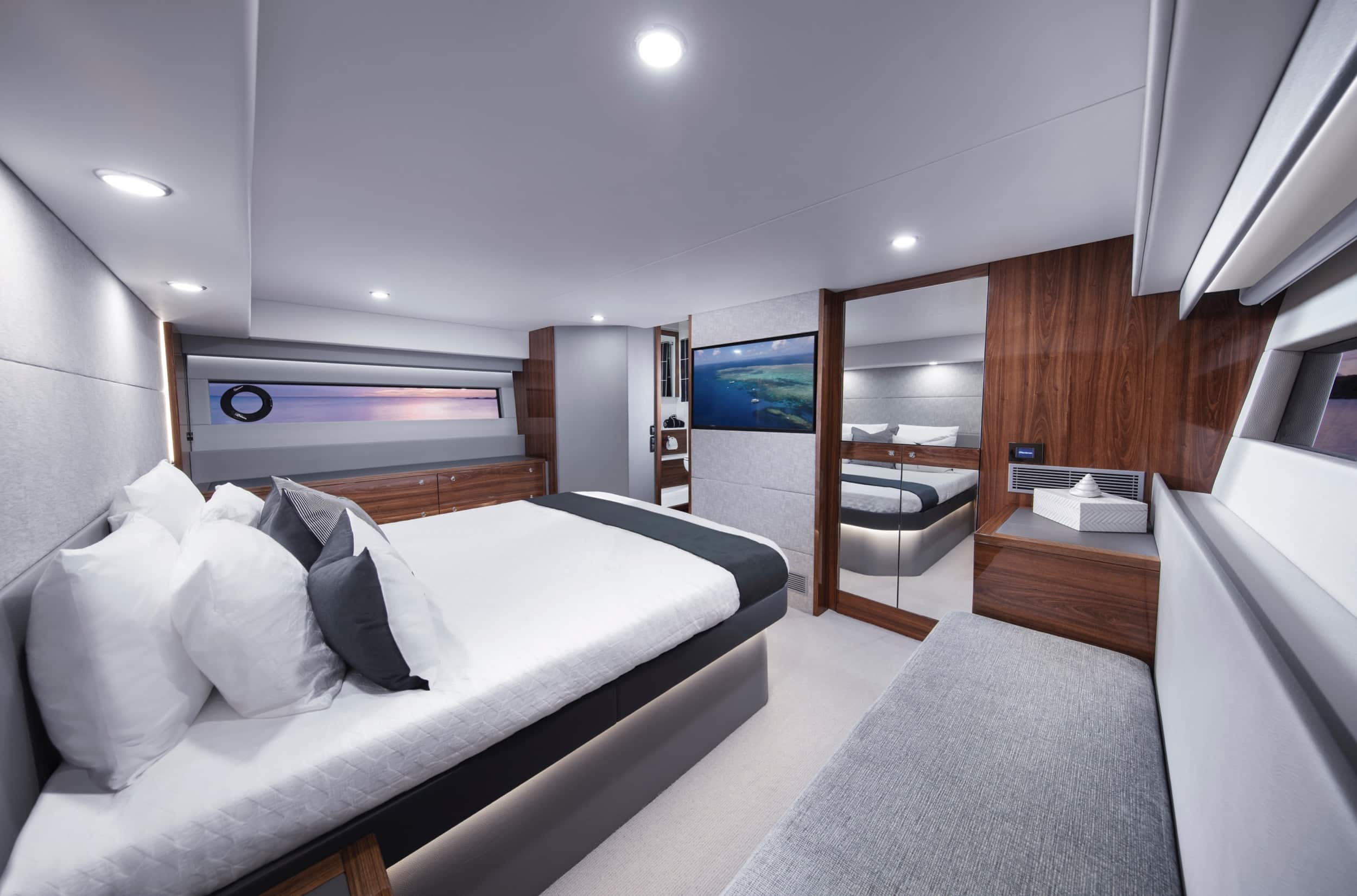 The three stateroom, two ensuite layout is designed to maximise every inch of the internal hull volume provided by the 5.2m (17.0’) beam.