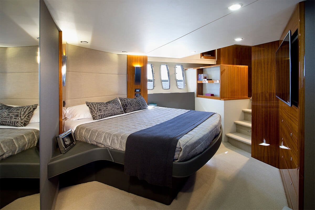 Haines said Maritimo’s race proven shaft drive technology reduces fuel consumption and gives the peace of mind of lower maintenance costs and increased longevity of ownership. Like the M59 the vessel has a draft of 1.225 metres (four feet) and a fuel capacity of 4400 litres. Water capacity is 900 litres. The vessel can sleep six people comfortably. Standard engines are twin Volvo D11-725 hp power plants and a Cummins Onan 17.5kw generator.