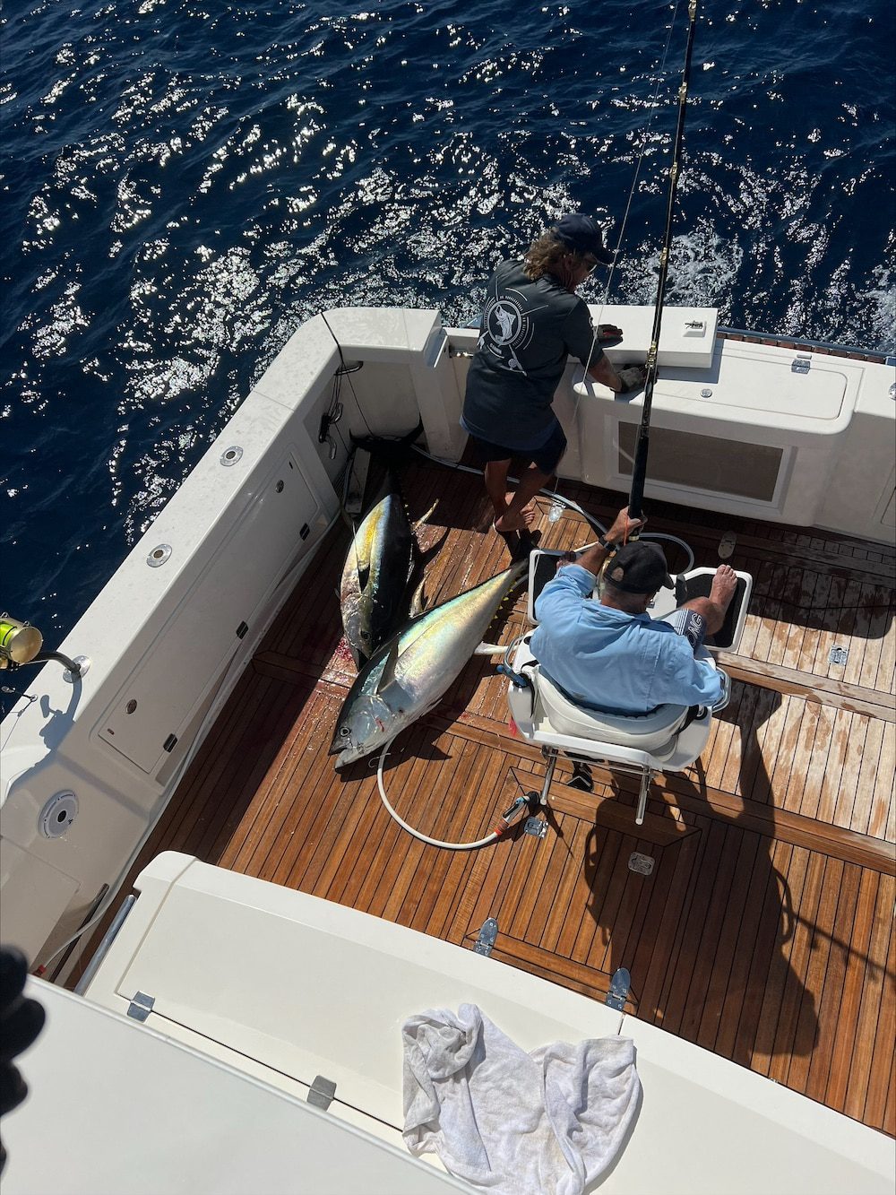 “There’s enormous room at the back of the boat which allows the chair to be out of the way of the lazarette, and we have adjustable slats in the huge fish well to stop the smaller fish sloshing about so much. It’s a great set up with larger slats in the shorter swim platform so when we back down on a fish the water can escape, especially in the gap between the platform and the transom. The toe holds around the cockpit are great for stand-up fishing and placing tags in, but for me I just love the aft helm position, as it affords great visibility, and I am into the finding of the fish, much more so than the bringing them to the surface aspect of our sport.”