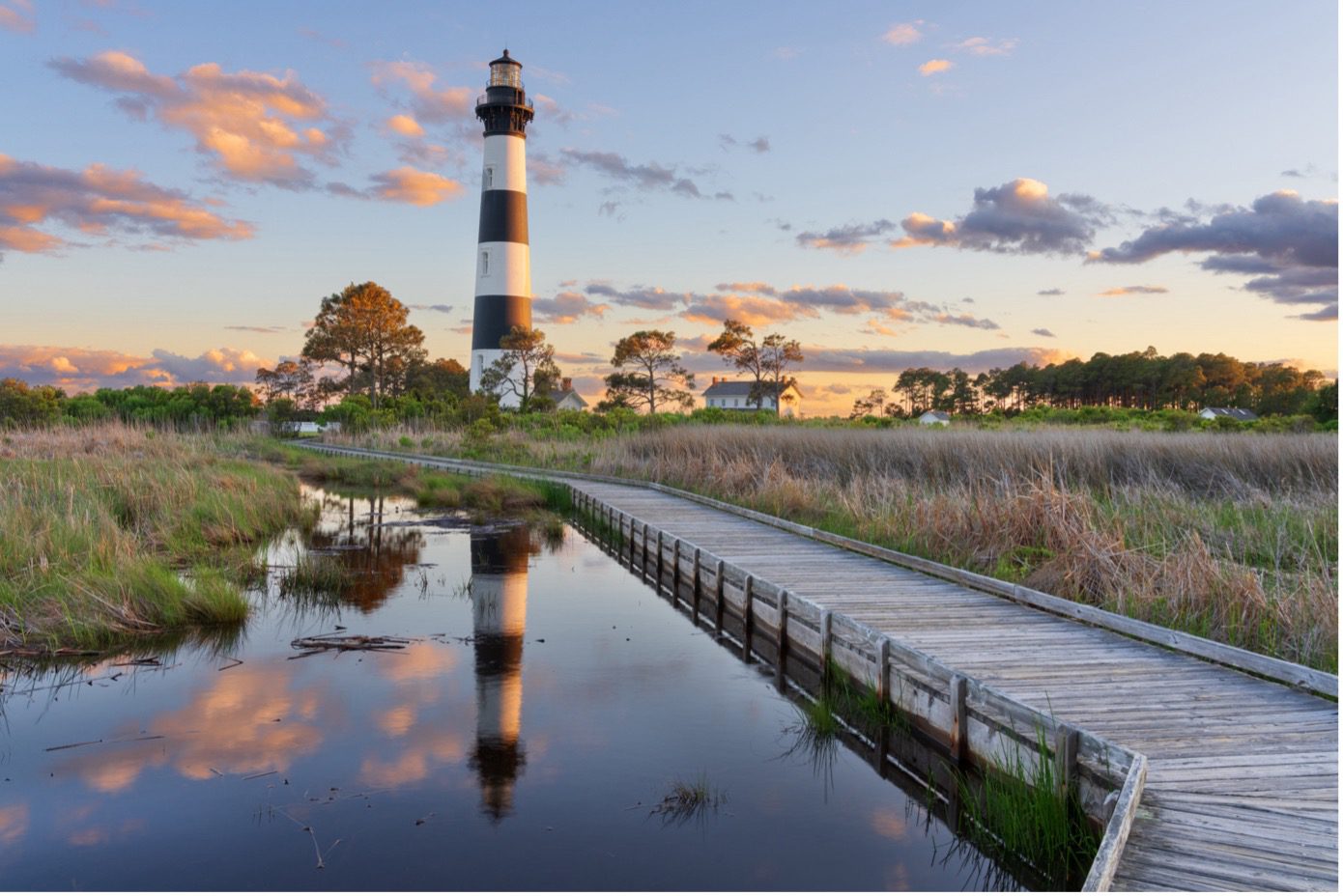 Further north, the coastline becomes wilder as you approach the legendary Outer Banks. This chain of slender barrier islands stretches like a protective ribbon along the Atlantic, shaped constantly by wind and tide. Navigate your way carefully through inlets such as Oregon Inlet, where shifting shoals demand attention, but reward with breathtaking scenery.