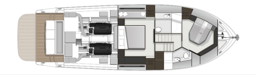 The reworking of the accommodation area floorplan to deliver a truly class-leading Master Stateroom space, along with an even larger VIP Stateroom featuring a double bed that splits into two singles and an abundance of overhead storage lockers. The scale and grandeur of both bathrooms have also been increased significantly.