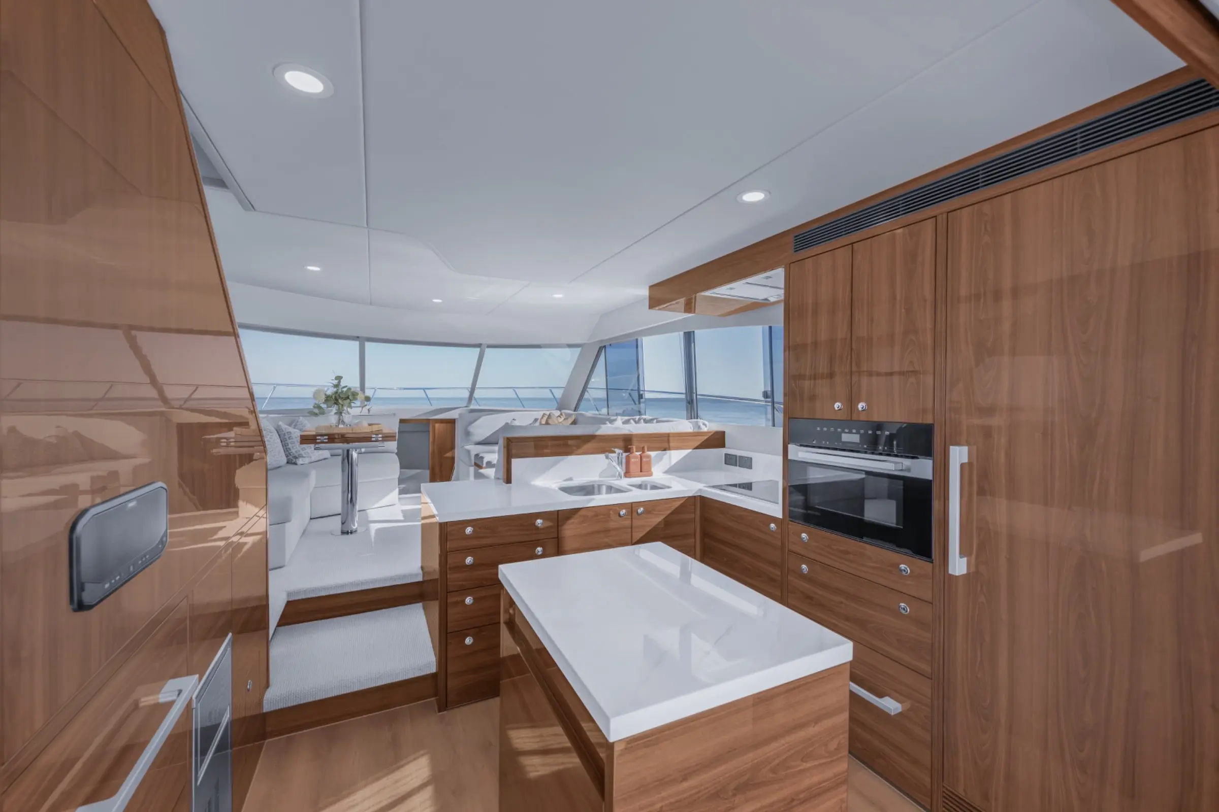 The galley itself is a true chef’s domain, featuring premium European appliances, impeccable finishes, and extensive storage. An L-shaped layout with a central island provides generous preparation and service space, effortlessly supporting both the cockpit and interior living areas.