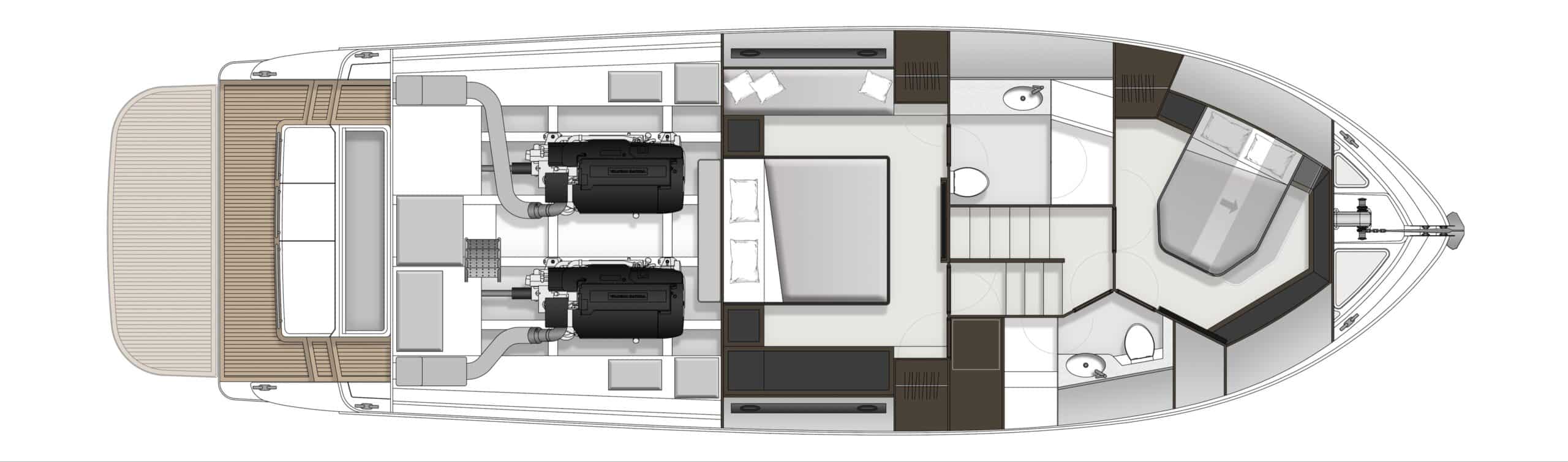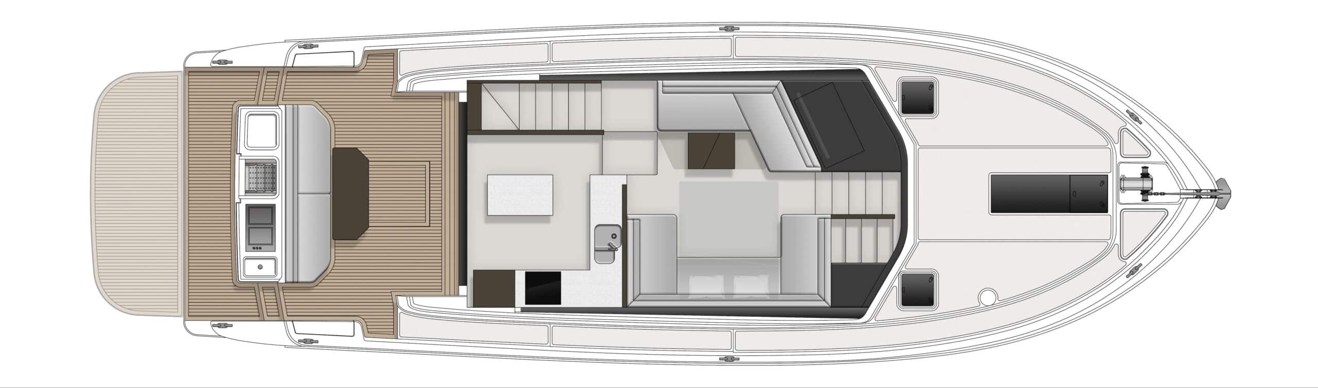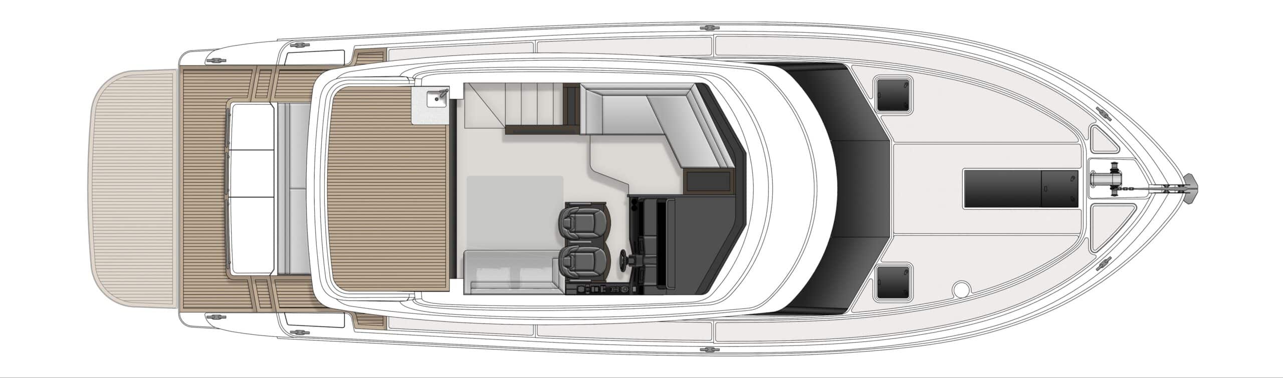 Relax and entertain in style in the completely redesigned upper cockpit space. Seamlessly connected to the galley on the same level, without any steps, this design seamlessly integrates the indoor-outdoor lifestyle.
