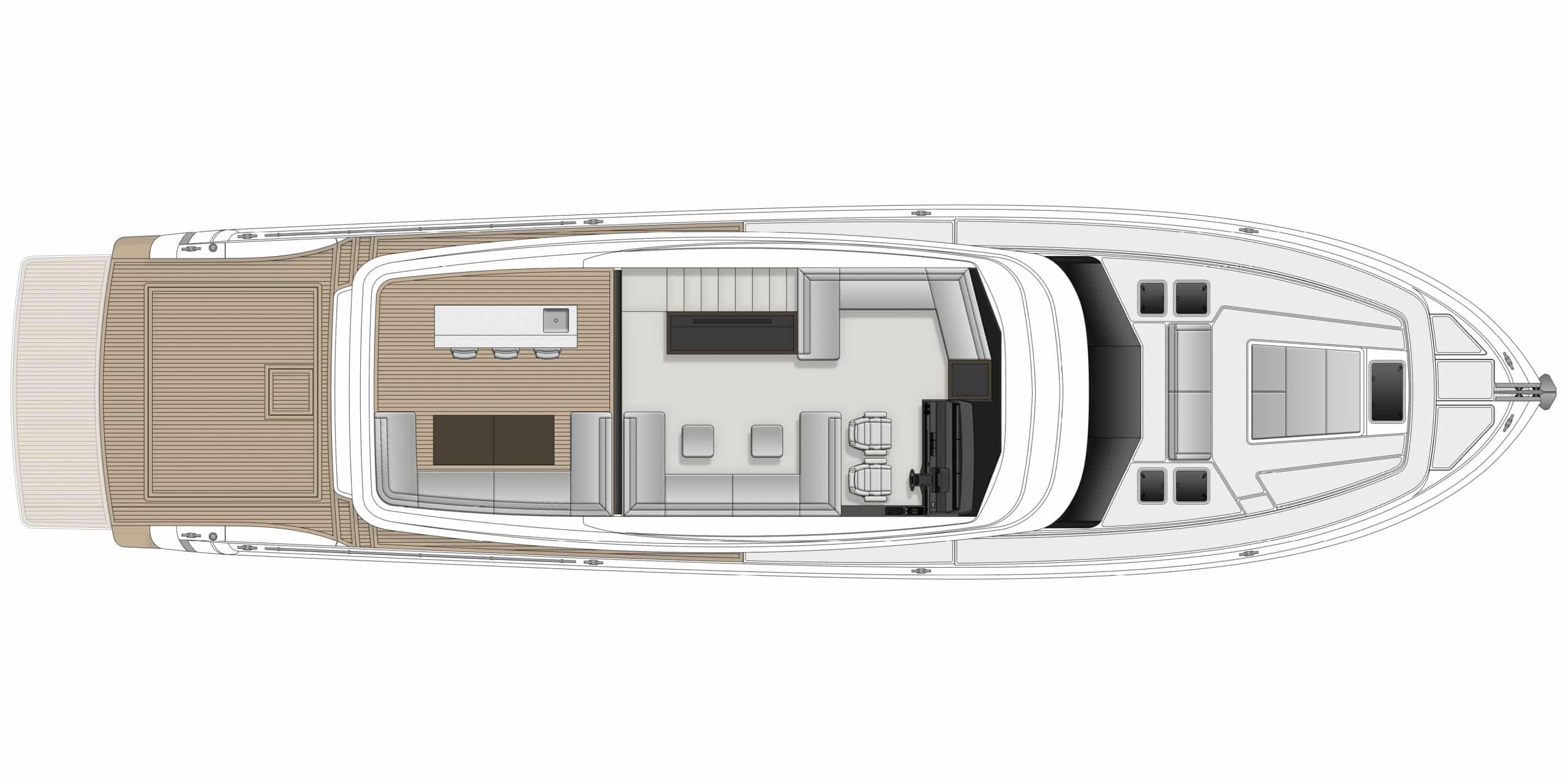 The M75’s climate controlled flybridge skylounge offers unprecedented amounts of interior space through the design of the exterior wings melded within the swept contours of the flybridge’s exterior form. The space incorporates a pair of distinct internal lounging areas, with a forward cruising lounge and aft TV lounging, which can both conveniently convert to additional sleeping berths if required. Beyond the flybridge sliding glass doors, the flybridge balcony deck offers further unprecedented amounts of deck space.
