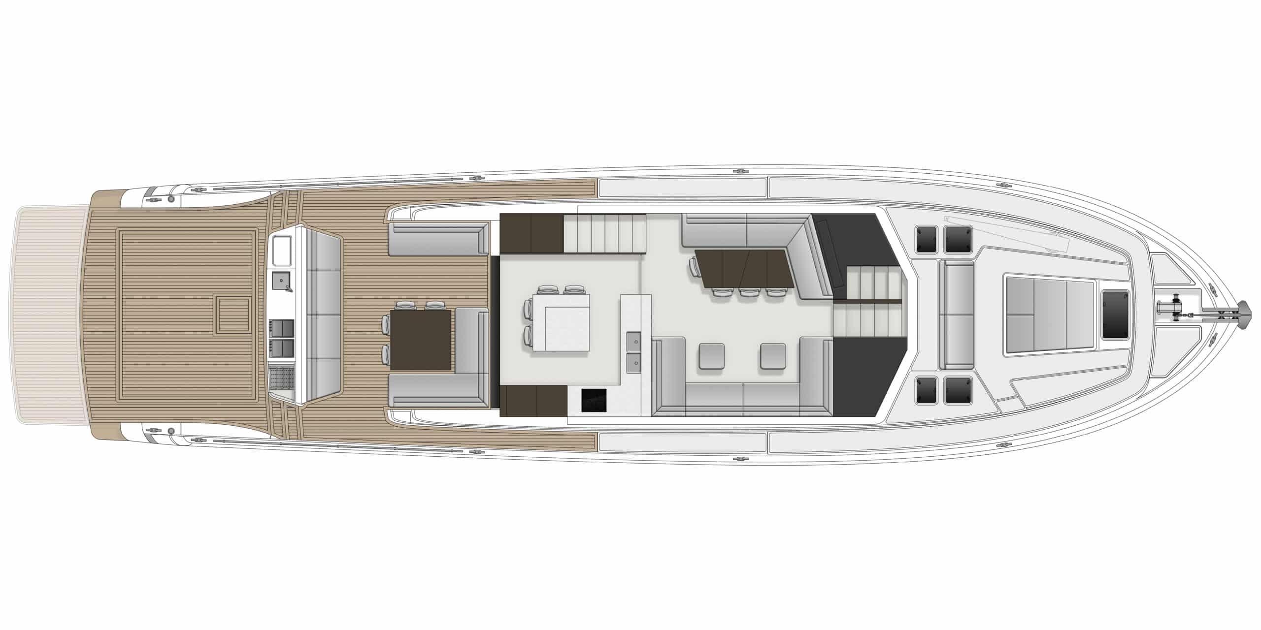 Step aboard, and the first impression the M75 emanates is certainly that of unsurpassed amounts of deck space. The M75 adventure deck creates an incredibly versatile hub for lounging, cooking, adventuring or storage, with plenty of room to spare.