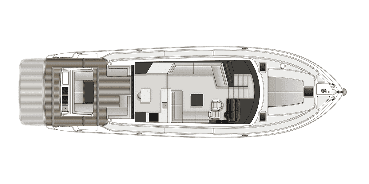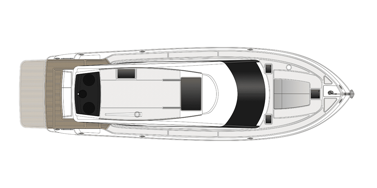 The amount of floor space offered in the upper cockpit alfresco deck leads the market in the mid 50 foot category, with standard rear U-shape lounging and dining table and further option of opposing lounging flanking each side of the area.