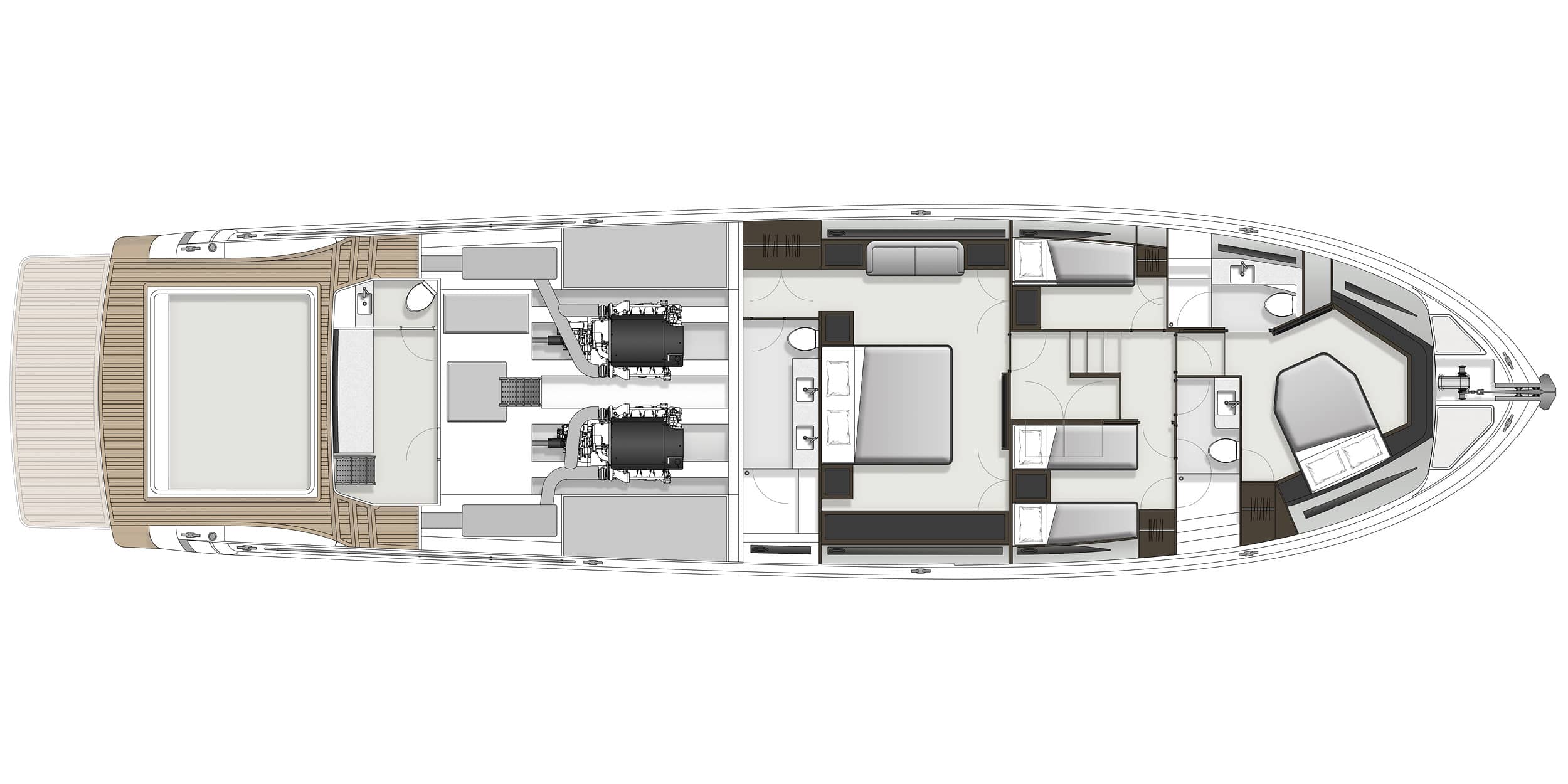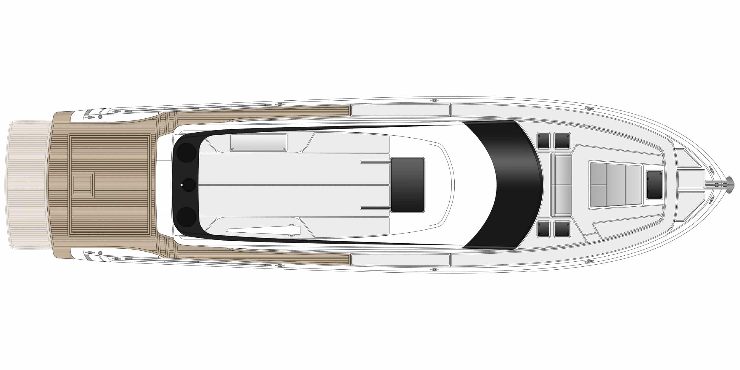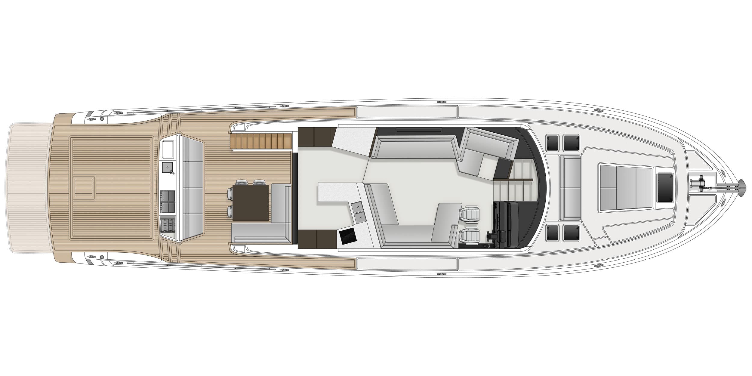 The amount of floor space offered in the upper cockpit alfresco deck leads the market in the mid 70 foot category, with standard rear U-shape lounging and dining table and further option of opposing lounging flanking each side of the area.