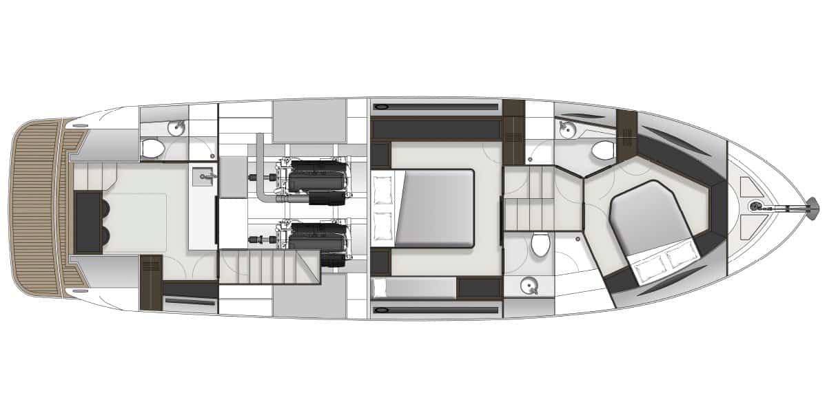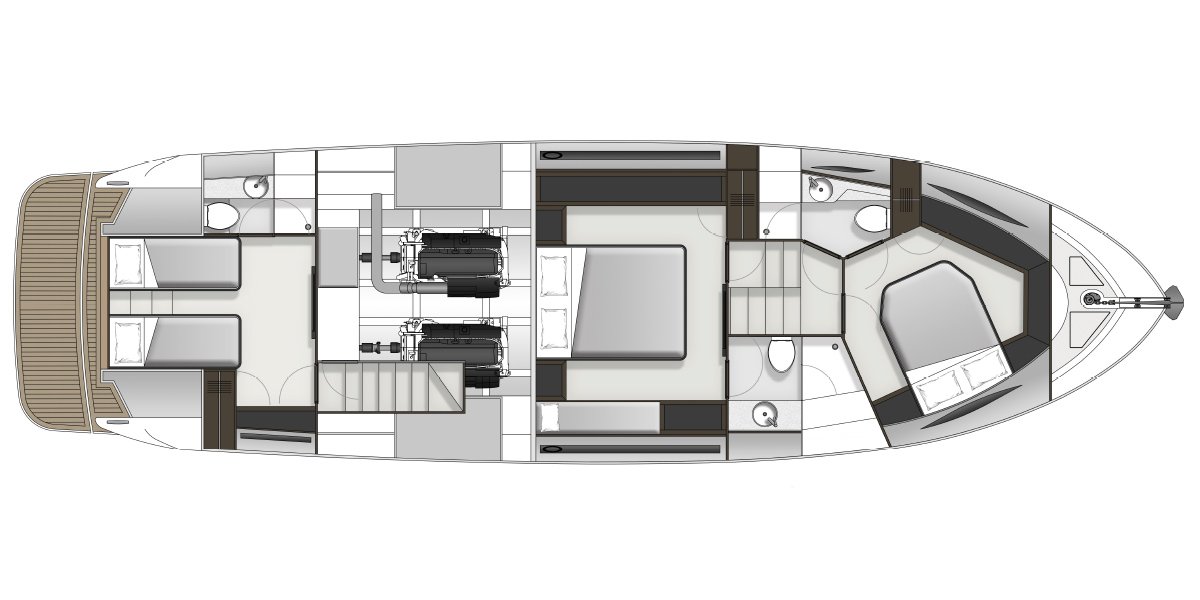 A critical performance factor inherent in all X-Series hull design, is the ability to neutrally balance the hull through the planing range. Volvo Penta D11 670mhp or 725mhp power units are located further forward to neutrally balance the hull and minimise shaft angle, resulting in increased efficiency from the 5 Blade Nibral propellers and a flat efficient planing attitude, this is made possible by incorporating additional accommodation aft of the engine room. Maritimo’s world renown patented engine room moulding technology provides more strength and weight reduction with added serviceability and reliability.